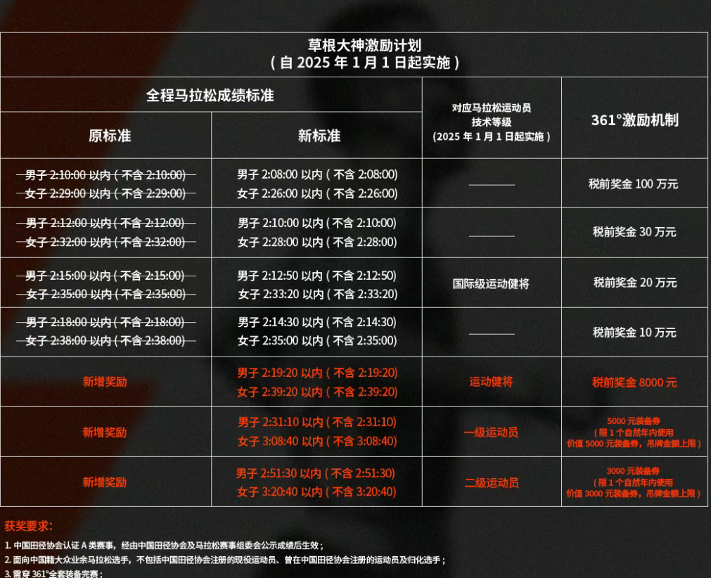 2023年下半年,361°曾经发布过一个草根马拉松大神激励机制,其中最高奖金100万元。今年1月开始,361°更新了奖励机制,规定达到男子2:14:30和女子2:35:00的成绩后可以获得10万的奖金。